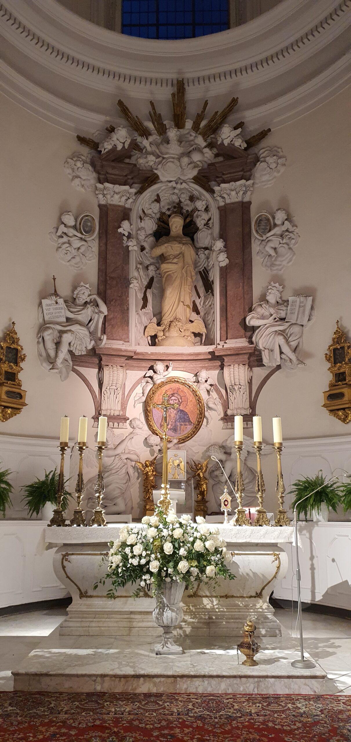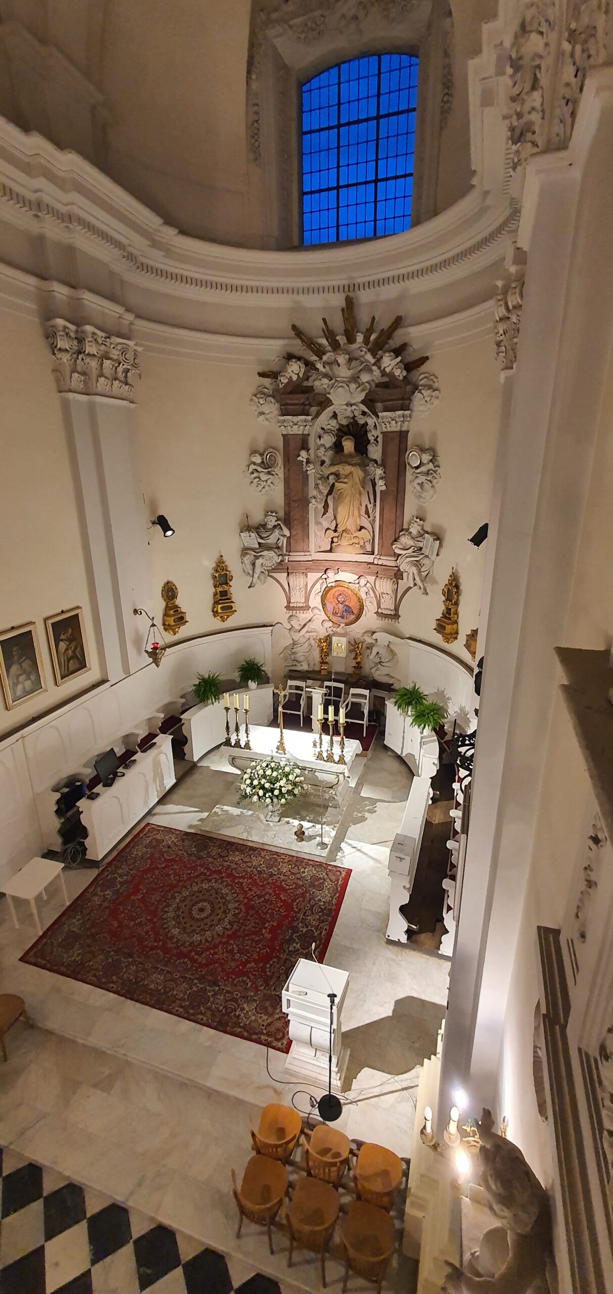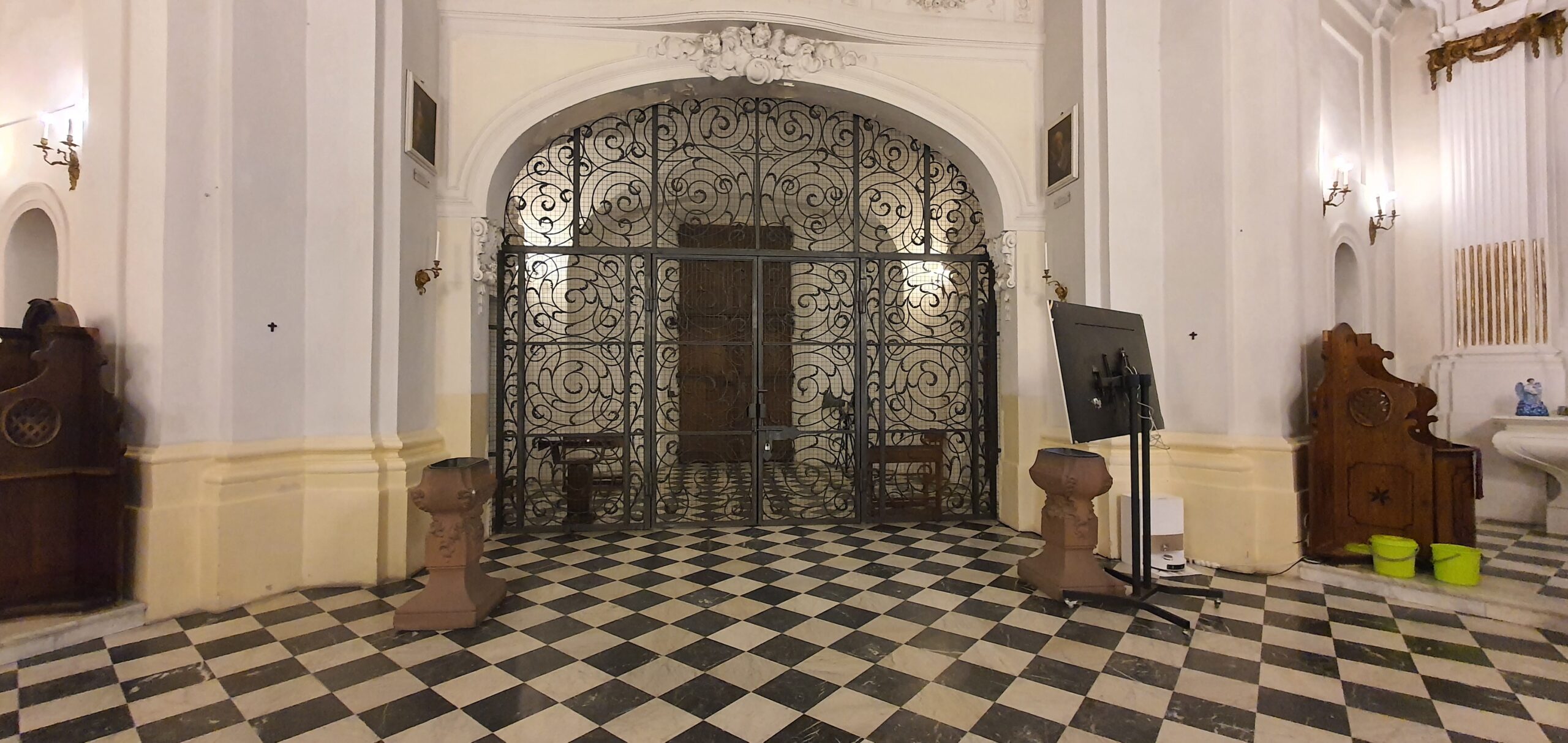 Około 1696 r. trzy cenne kompozycje freskowe w sklepieniu zakrystii wymalował wybitny malarz z Toskanii, wykształcony w Rzymie na najnowszych wzorach berniniowskiego dojrzałego baroku – Michelarcangelo Palloni (1637–1712, w Rzeczypospolitej od 1674). Przedstawiają one Ofiarę króla Salomona oraz świętych: Benedykta i Romualda. Z tej samej fazy pochodzą zdobiące od pierwszych lat XVIII w. chór kapłański stiukowy, naścienny element ołtarza głównego w formie edikuli oraz wykonane w tej samej technice, ozdobione akantem i floraturami obramienia okien, bocznych portali i otworów lóż w masywach wież. Ten pierwszy jest unikatowym przykładem takiej struktury z kolistym okienkiem-okulusem w tle środkowej niszy, za głową statuy patronki – Immaculaty (rzeźba wtórna, zrekonstruowana po 1945 r.) – i niewielką glorią berniniowską w zwieńczeniu, z półfigurą Boga Ojca w otoczeniu aniołków. Poniżej znajdują się ulatujące figury anielskie, po bokach – wzorem nowożytnych rozwiązań z Lacjum i Lombardii – siedzące na odcinkach gzymsu postaci patriarchów Starego Testamentu. Domniemanym autorem ich wszystkich był zapewne warszawski stiukator Francesco Maini vel Maino (zm. 1721). Warto wspomnieć, że do początku XX w. na granicy pierwszego i drugiego przęsła stała drewniana przegroda ołtarzowa z dwiema mensami i tylomaż bramkami, zasłaniająca przepisowo klauzurowy chór zakonny ze stolarskimi, zachowanymi dzisiaj stallami. Przegrodę i ołtarz usunięto po przejęciu opuszczonego w 1904 r. przez zakonników kościoła i eremu przez kler diecezjalny, a od 1915 r. przez księży marianów. Dzisiejsza białomarmurowa mensa ,,posoborowa” z neostylowymi ornamentami pochodzi właśnie z tego czasu ąi zaprojektował ją arch. Józef Pius Dziekoński (1844–1927).