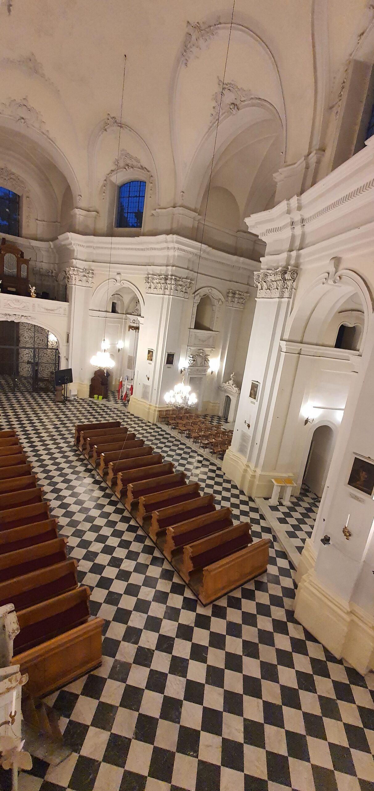 Z kolei pierwszą zapowiedzią klasycyzmu są cztery boczne ołtarze architektoniczne wkaplicach przekątniowych, zależne formalnie od zaprojektowanych przez Fontanę ok. 1760–1763 r. analogicznych nastaw bocznych w ciągach kaplic korpusu świątyni wizytek przy Krakowskim Przedmieściu. Uważna obserwacja każe domniemywać, że mamy tutaj do czynienia z co najmniej trzema różnymi stiukatorami, z których dwóch wzięło udział w robotach u wizytek jako współpracownicy najwybitniejszego podówczas rzeźbiarza saskiej Warszawy – Johanna Georga Plerscha (ok. 1700–1774). W tym samym okresie wśród zleceniobiorców prac malarskich znalazł się Franciszek Smuglewicz, stypendysta rzymski i malarz nadworny Stanisława Augusta Poniatowskiego, który wykonał okazały obraz ołtarzowy Matka Boża ze św.św. Benedyktem i Romualdem, umieszczony we wschodnim ołtarzu bocznym. Warto zwrócić uwagę, że ta konkretna nastawa stiukowa pochodzi z pocz. XX w. i jest neostylowa, anonimowego autorstwa.